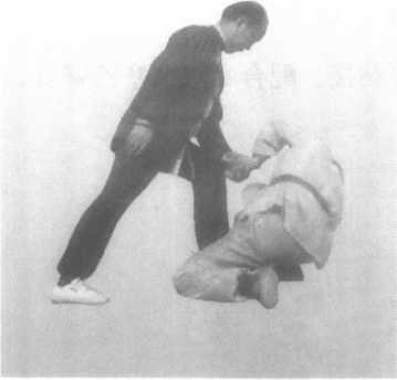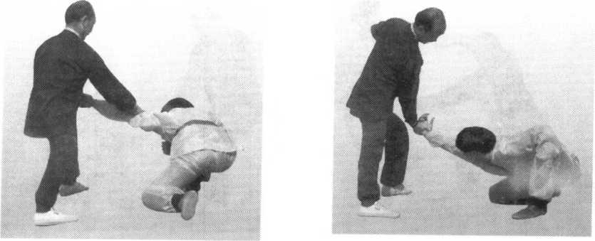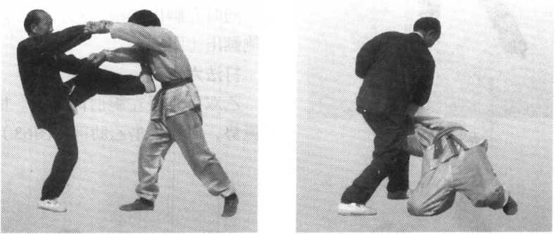 乙从正面用右拳向甲胸部击来。甲 以右手粘乙右腕,左手粘乙右肘,向右 撅去,乙栽倒在甲右侧(图58)。