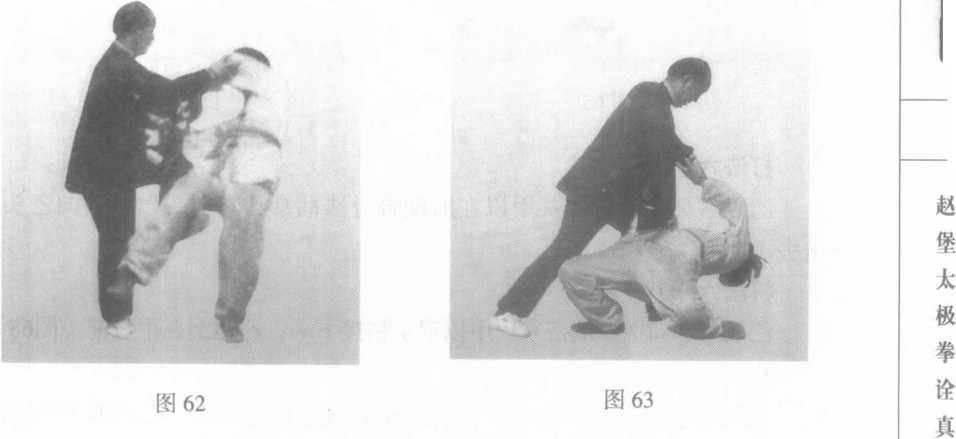 乙双手制甲左腕肘,往外撅。甲 以右手粘乙左肘,双手顺乙撅势打 去。同时左脚以脚跟勾乙右脚,乙从 左侧翻出(图62)。