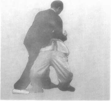 乙以双拳向甲左侧击来。甲以 双手管乙右腕、肘外引,以左脚踢