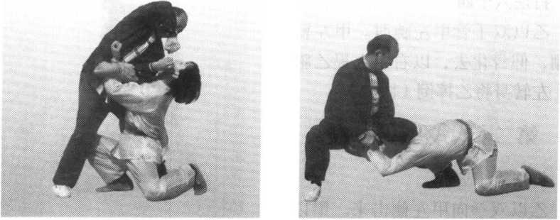 乙以右拳向甲头部击来。甲以右手 粘接拿住外旋,向下、向上转动,乙栽 倒在甲身前(图60)。