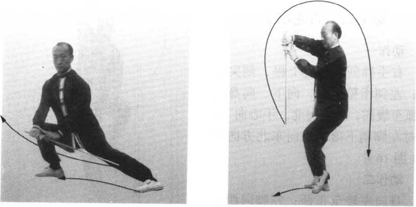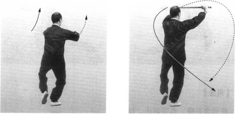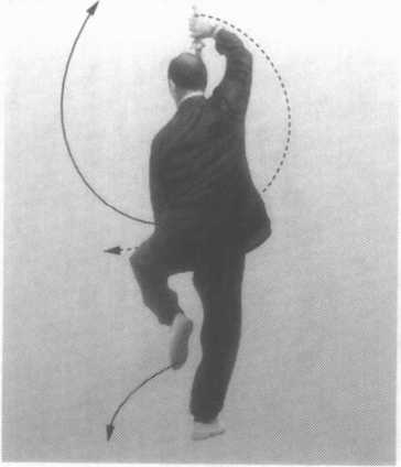 身长起;右手握剑外旋,手心向东,后内旋,以剑尖向东北、向下刺 去;左剑指向上划弧提起,两臂相通成一条弧线;同时,左脚提起,脚心 向内,身向东北稍探。眼看剑尖(图15)。