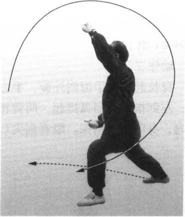 身下蹲;右手握剑,向上、向后、向身右侧、向下以剑刃削至东北方