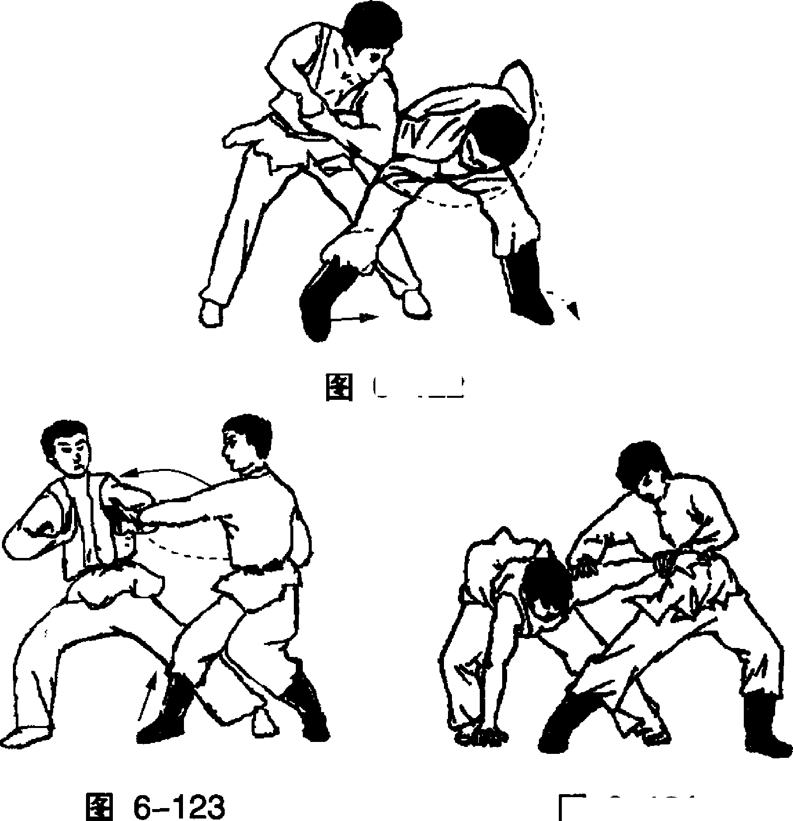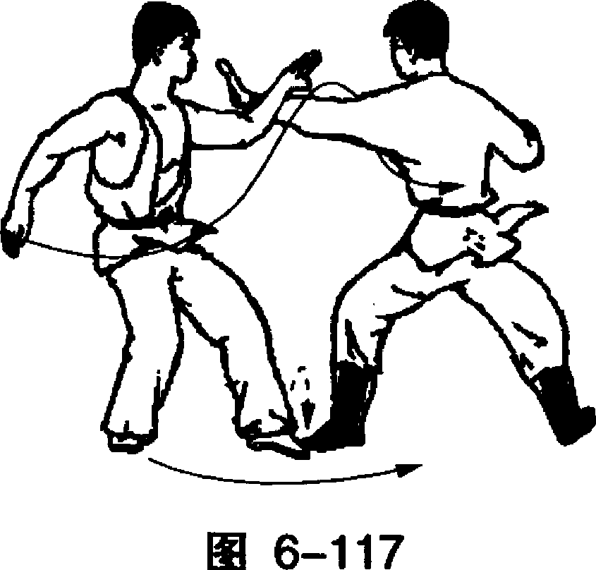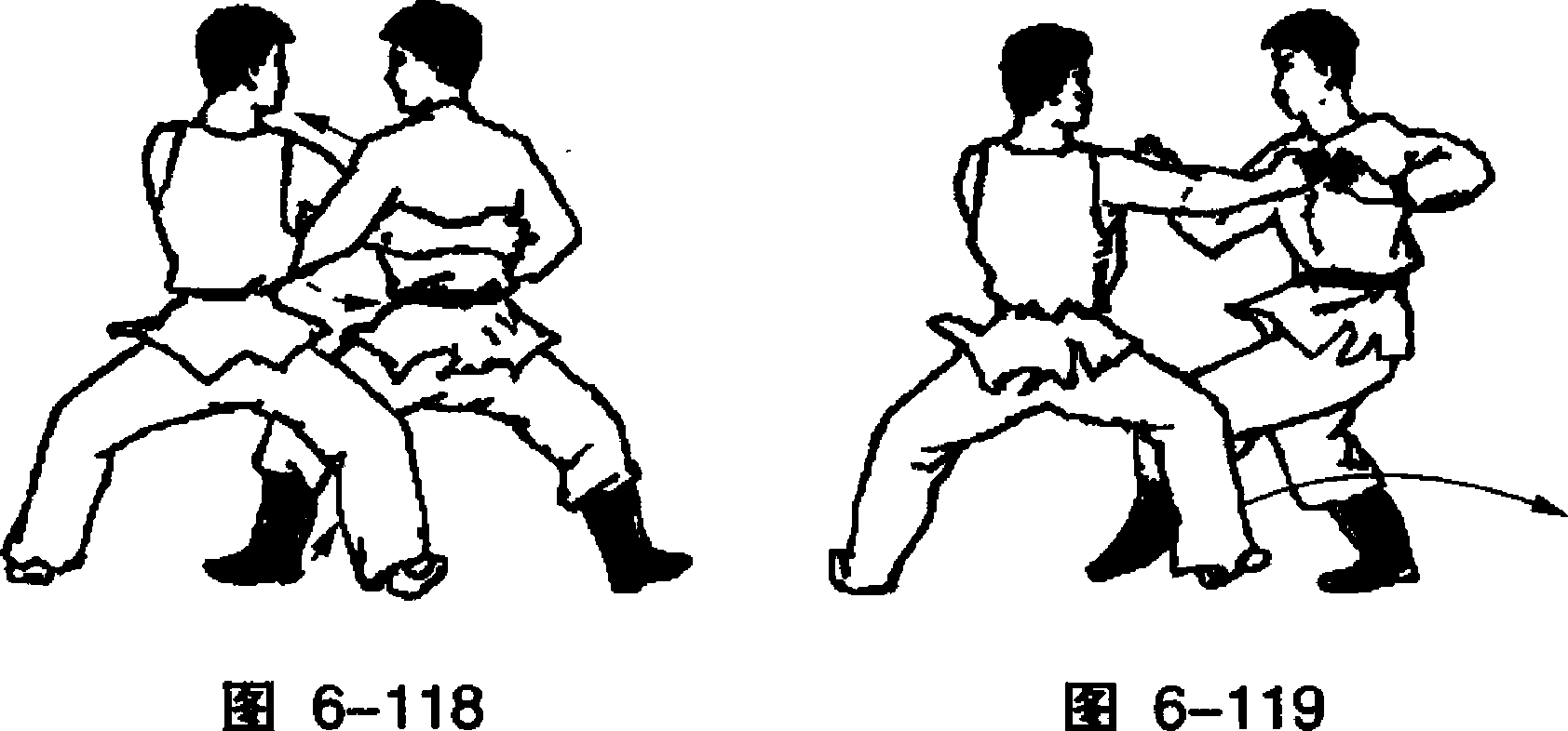 乙左脚在右脚前猛烈震脚,右脚上步插在甲左腿后,右臂 由后经上向前以肘压甲左臂后,下插抱住乙腰部。(图6-118)