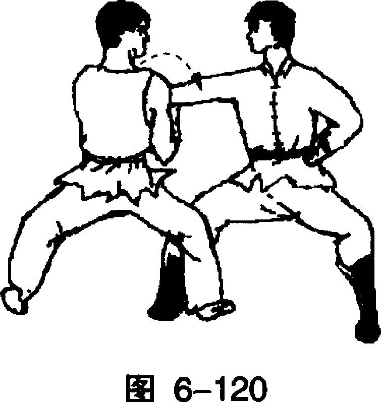 甲被擒,急速左后转,同时,左臂伸直,挣脱甲的搂抱。 (图 6-119)