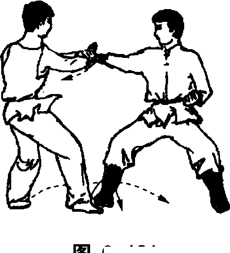乙右手腕绕环至指扣紧甲手腕内侧,将甲手腕外拧,置于 腹前。同时向右转体90。,右脚震地,左臂压甲右臂,左脚上 步插进甲身后。(图6-122)