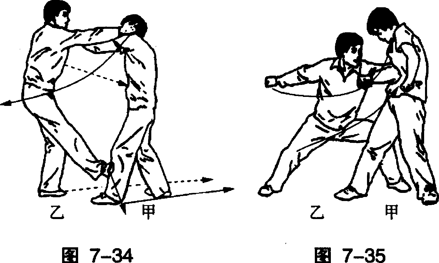乙见甲左拳击来,屈左臂向外格拦。(图7-33)