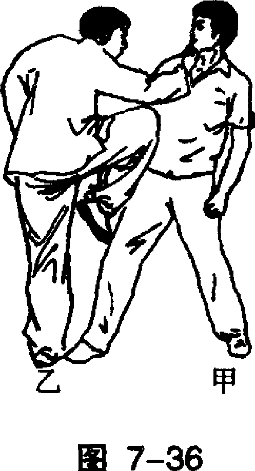 若顶击不中,乙用右膝 顶撞甲腹裆,同时用右拳击 打其下颁。(图7—36)