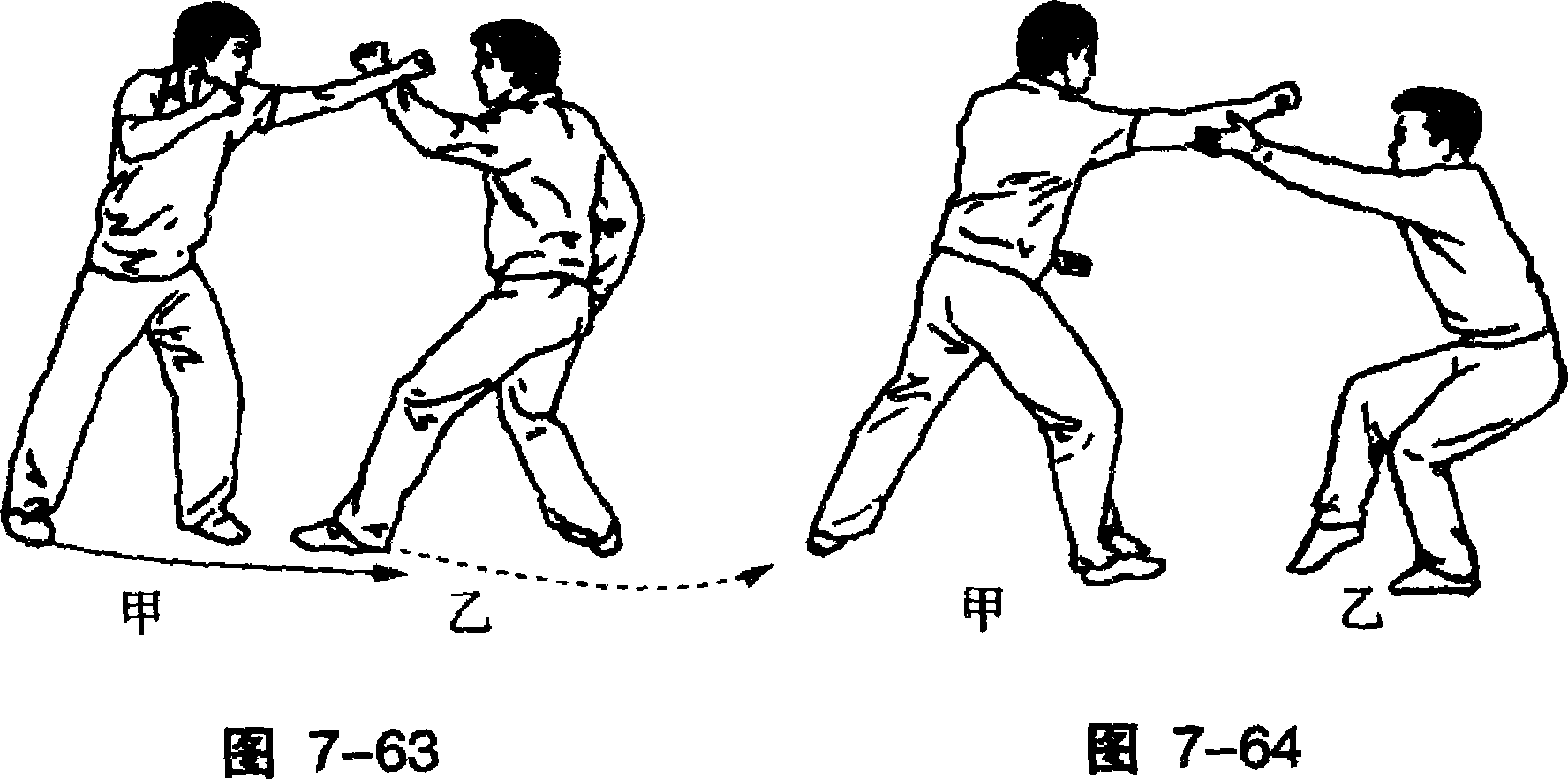 乙见甲左直拳击来,速屈 左臂向上架挡来拳。(图7-63) 甲右脚前上一步,同时用