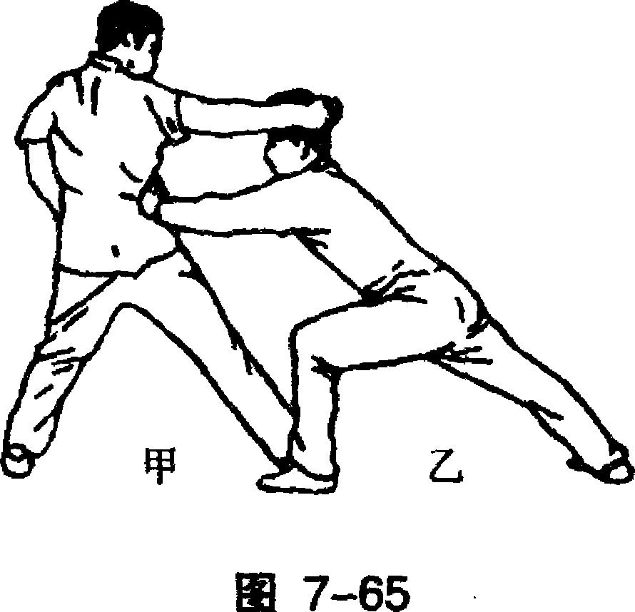 乙动作不停,速上左 步成左弓步,同时双掌并 击甲肋部。(图7-65)
