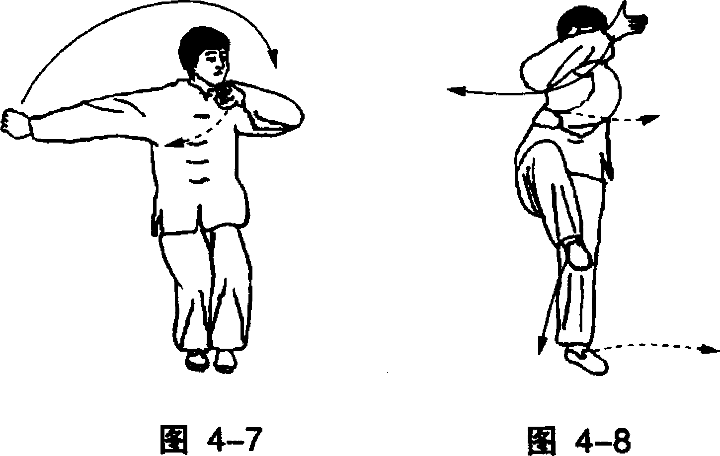 身体起立,左腿支撑体重,右腿屈膝上提;同时左拳向右 下摆于右肋下,拳心向下,拳面向右;右拳成掌,屈肘向上、 向左摆举于左耳前上方,掌心向后,拇指侧在上。目视前下 方。(图4-8)