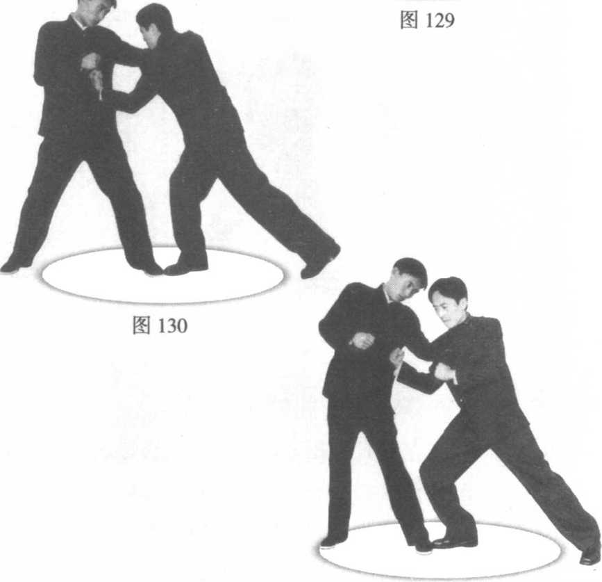 对手以左脚在前时,我方以前手直拳直接攻击对手头 部,对手被迫上抬防护手阻挡,但在防护头部时暴露了身 体中段部位。我方迅速移动,把握时机,后手勾拳猛击对 手腹、胸部。对手被击而移动,我方紧接着以前手勾拳重 击对手腰、肋侧(图127 ~图131 )o图131弟四节