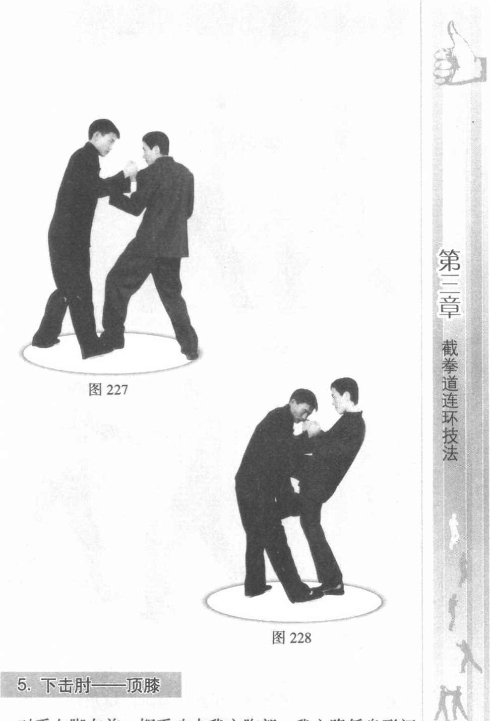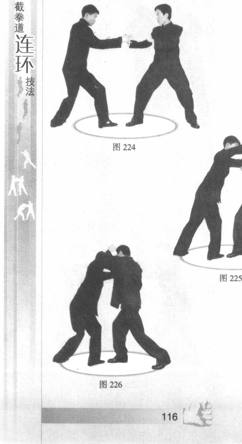 对手右脚在前并扑向我方,在贴身纠缠中,对手挥手攻打我方头部,我方屈肘格挡同时,后手紧接着以肘下砸对手肩、颈部位。 对手被击闪躲, 我方后脚踏进对 手中门,前脚迅 速提起,猛然膝 撞对手腹肋侧, 迫使对手停止攻 击(图223 ~图 228 )o