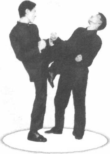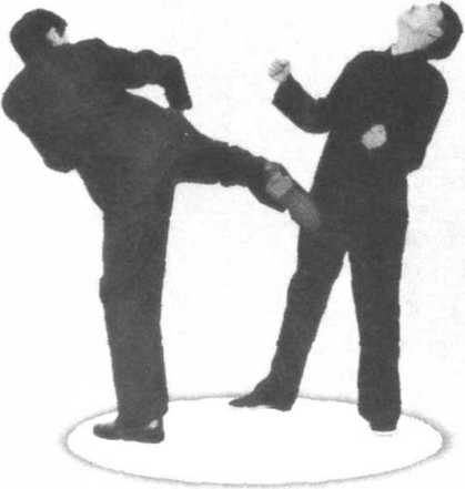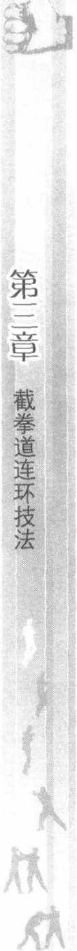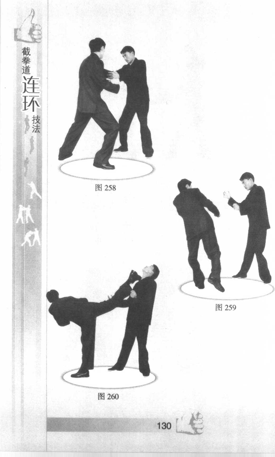 保持重心稳固,右 脚借腰髓后摆,向 后反踢对手头、颈 部。对手被击摇晃 时,我方后脚即右 脚落地,前脚随身 体拧转提起前滑, 猛出膝顶刺对手腹、 肋部(图257 ~图 262 )o图261图261图262图262图261图261图262图2625.撞膝——劈踢