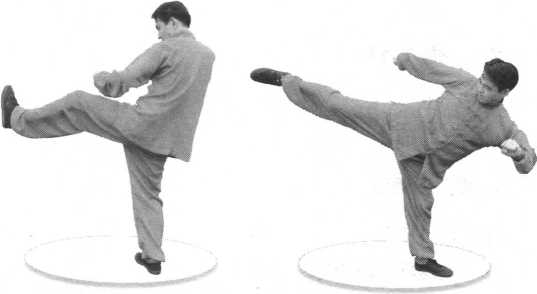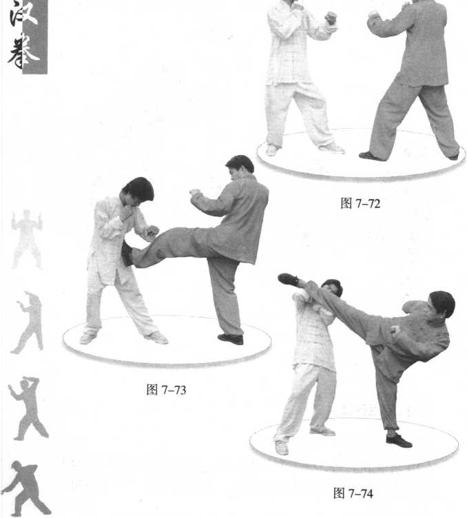 (2) 我见机急进,先发左势蹬山腿,踢敌身体。(图7-73) (3 )幡追击,再发右势甩鼬,连踢敌身体。(图7-74)