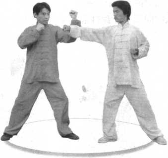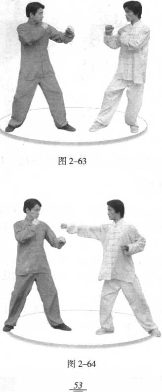 (1) 左门对敌。(图2-63)(2) 假敌向我中下盘打来。(图2-64)图 2-65(3 )我急用左前臂向里搬拦,破开来招。(图2-65 )【要点解析】1. 此招也是主要防守法。用前臂压或拨敌来节(来臂或 来腿),向下顺应重力,向里以横破直,非常省劲,操纵便利, 八易于使用。2. 上一招是破解对我的上、中盘的进攻,此招主要对付 下、中盘的攻击。“提拦法”和“搬拦法”都是旧称,不必深 究,知技即可。3. 技击以胜人为终极目的,要想胜敌,必须进攻,所以 不能单纯地防守,要“防则为攻,一防即攻”。