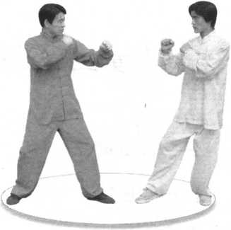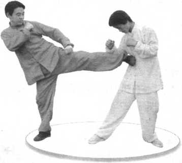 2. 此招中长距离使用,腿形多用中势,中势稳定,安全 度高,并且发劲完备,能冲伤敌内脏。