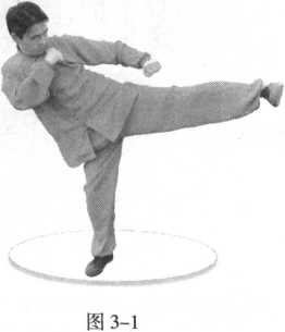 (2) 身体右侧,左腿向前中位跺击,脚腕勾起,脚尖向 右,脚跟向前。(图3-1)