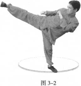 (2) 身体左侧,右腿向前高位跺击,脚腕勾起,脚尖向 左,脚跟向前。(图3-2)