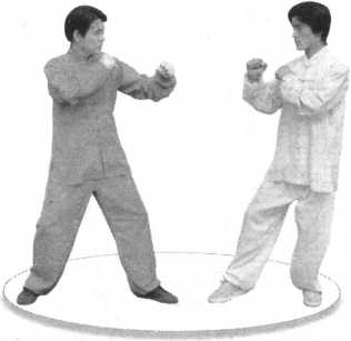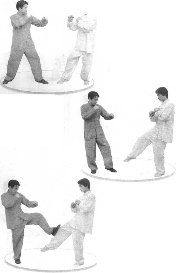 [招法单练】1. 蹬堵法(1) 左门预备。(2) 左腿向前下蹬 踢,身体正向,膝节适 屈,脚腕勾起,脚尖向 前,脚跟向下,位高同 膝。(图 4-40)2. 跺堵法(1 )左门预备。(2) 身体右转,左 腿向前下跺踢,膝节适 屈,脚腕勾起,脚尖向 右,脚跟向下,位高同 膝。(图 4-41 )【实战举例】1.蹬堵法(1) 左门对敌。(图 4-42)(2) 假敌起腿刚向 我踢来。(图4-43)(3)我急出腿蹬在 其腿上,不让其踢开。 (图 4-44)图 4-42图 4-43图 4-44