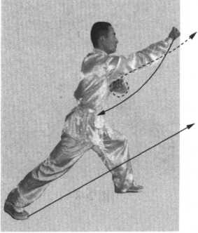接上势。左脚前移小半 步,随之,身体左转,右脚 上前一步成右虚步;右拳从 腰侧向前冲出,拳心向下, 高与肩平,力达拳面;同 时,左螳螂钩变掌向内格 挡,置于右臂内侧,掌指向 ±;目视右拳。(图2-7)