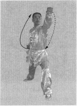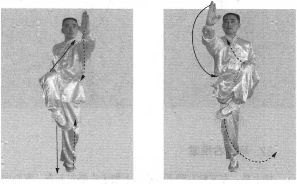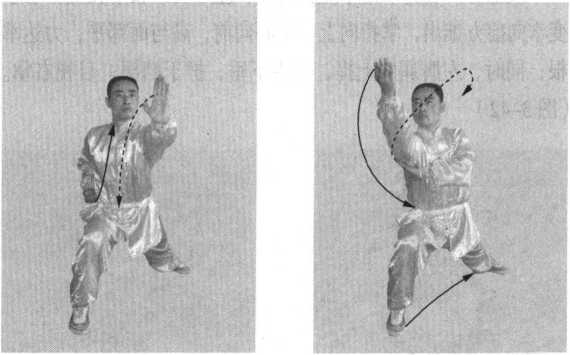 炉 接上势。步型不变;左掌下按于右胸前,右掌从左手臂上