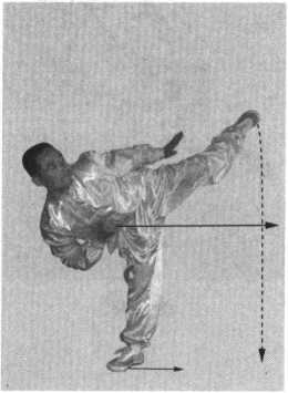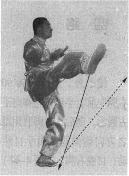 斜上一步,右脚跟进半步成左七星步;同时,右拳向左前冲 IV 出,拳眼向上,高与肩平,力达拳面,左拳后摆收于腰侧;目俗