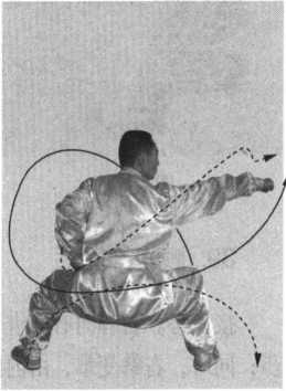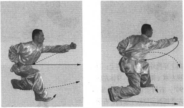 步;同时,右拳变掌,由内向外抓握变拳收于腰侧;左拳变掌 第