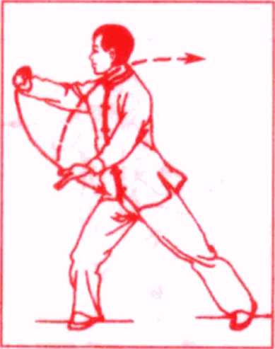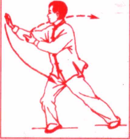 上体右转,重心右移,左脚随之向左碾转成右弓步,右肘外 旋,前曾伸展,右掌翻向中外横掌于右前方,左掌自左向右经腹 前划弧,掌心翻向上’目视右掌。(图110)