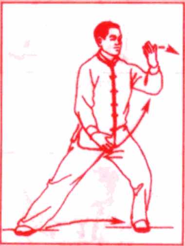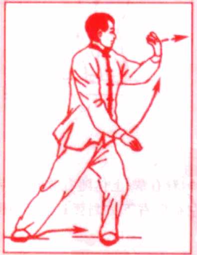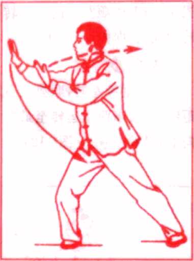 当右掌运转至面前时,眼睛转看右掌,上体随右臂向右转 动,指尖齐眉,重心移至右腿,左掌向右下方划弧运转。(图 113)