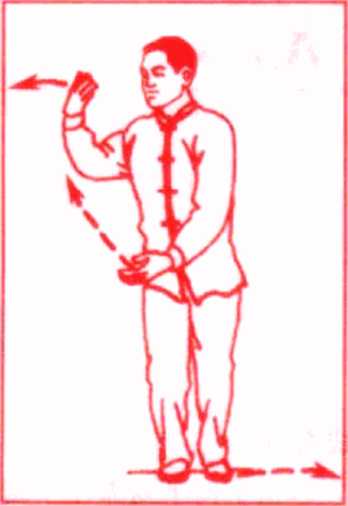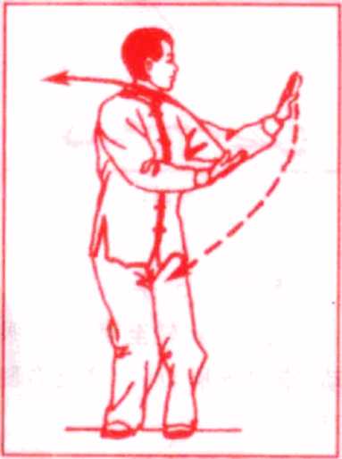 重心左移,右脚尖内扣,上体左转,右前臂屈肘内旋至右胸 前,竖臂翘腕,掌心斜向上.左臂随体转动平举,掌心向左;目视 右掌。(图109)