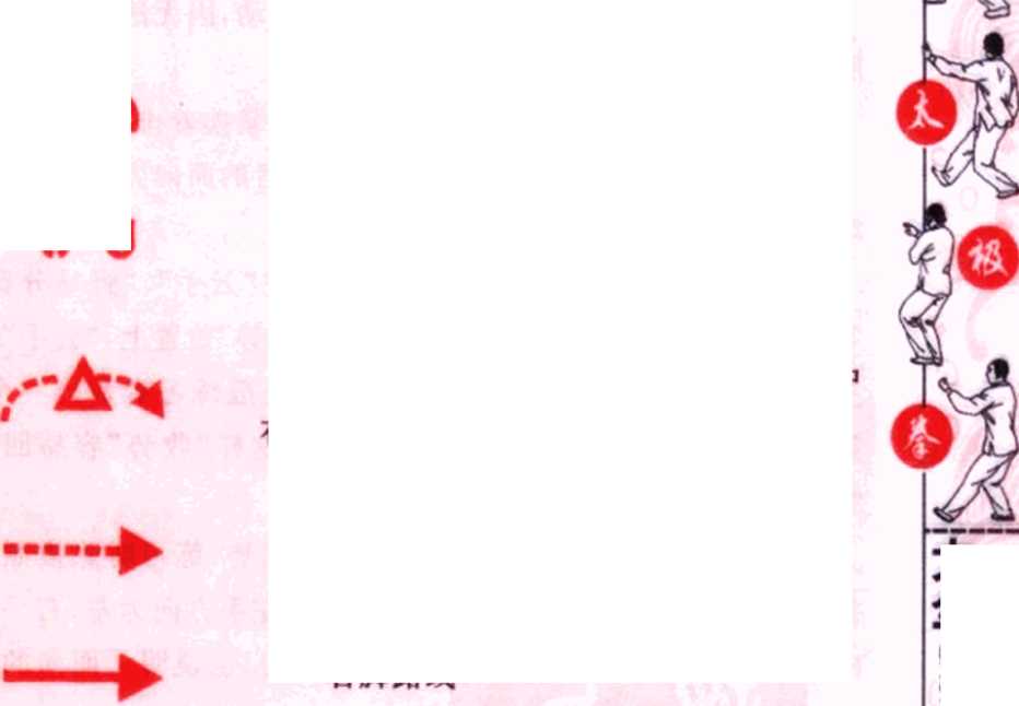 虚线脚为左脚,实线脚步为右脚;脚印 中不带括号的号码表示动作的顺序;脚印 中带括号的号码表示预备动作;空白脚印 表示过渡动作和“收势二