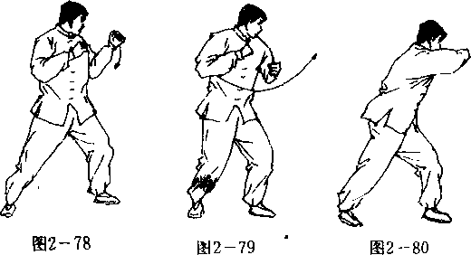 格斗预备势站立.(图2—78)左拳向下砸拳'拳眼向上, 拳面向右,(图2T9)动作不停,上体左转洞时右肘向前?、向 ■左拐击,肘尖向前,目视肘尖。(图2—80)