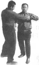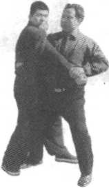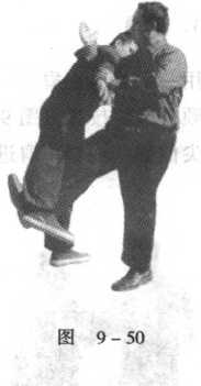 挑架侧踢里外杠。抓臂上杠腋下(图9-49),下部用脚拦 踢(图9-50)o也可正面双接手,顺肩捋拿肘部用拉变插臂、 裹脖杠别摔。
