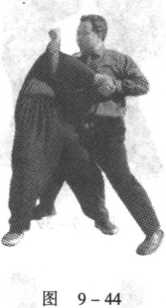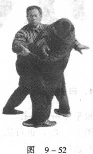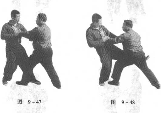 用一手托肘入肩,一手按胸,然后托肘手顺对方背部下滑摸 手,顺势拣腿按摔(图9-47、图9 -48)。单鞭如劈拳,劲力意 达指尖似鞭。抱臂用肩进步撞,勾脚放手拣腿劈。