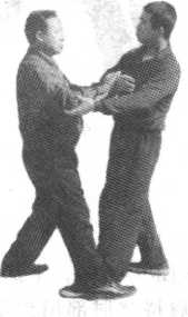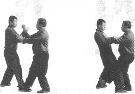 所谓拗步是指左脚对右手或右脚对左手十字找劲。接手捋带 用脚巧勾,上身用横撞(图9-51、图9-52)。也可拧身拗步横 劈下砍,接手抓肘戳窝走。