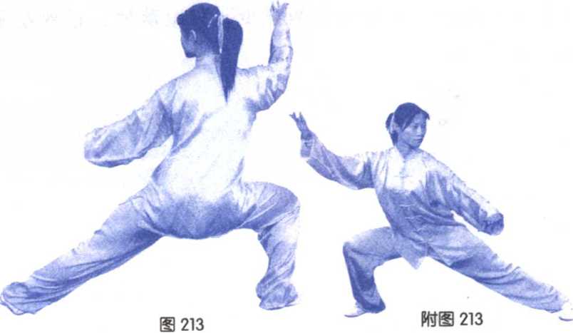 ④重心右移,上体左转,成右 侧弓步(横裆步),右肩向右倾 靠;两掌分别向右前上方和左前 下方撑开,右掌略高于头,掌心 斜向上,左掌与胯同高,掌心斜 向下;目随左掌。(图212、213 附图213)
