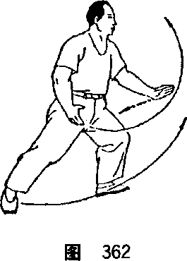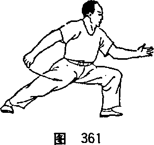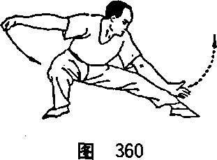 [动作口 左胯根微弧形下沉往前移动,小腹随着先往右 后绕小圈,然后向左前移动,右胯根紧跟向前送。腰微向左前 弯,使左掌下沉从左脚面前抄出。(图360)