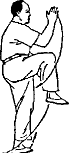 2. 当左弓步坐实时,右胯根仍前送,右膝渐渐向前提起, 左腿渐渐起立9不要左腿先起立,然后再提右膝。