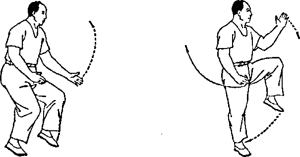 3. 由左独立变为右独立,要注意右足落下时,左腿要同时 落胯,屈膝、下蹲,不要右足落下而左腿不动。当右腿坐实,左 腿提膝时,右腿也要随着渐渐起立。
