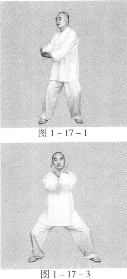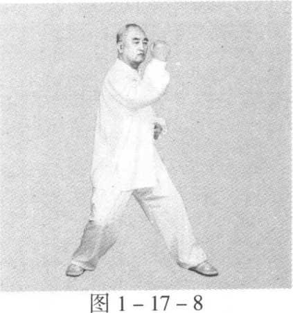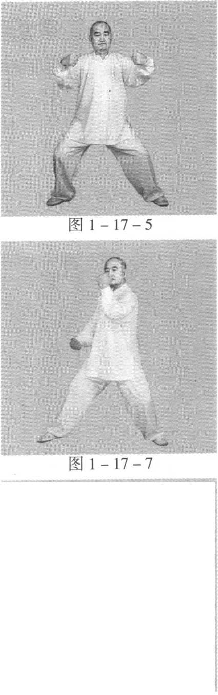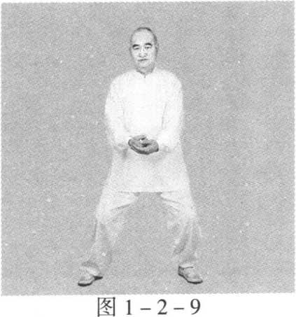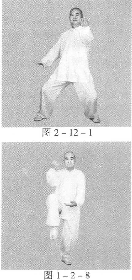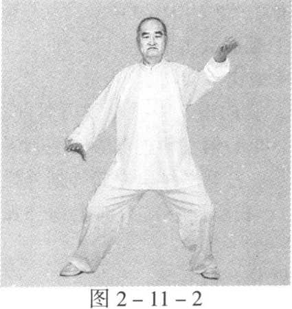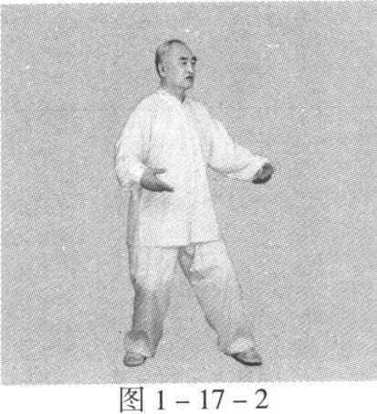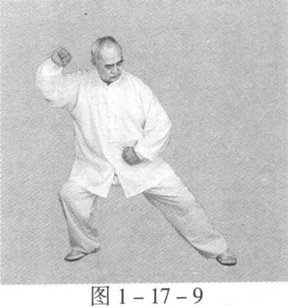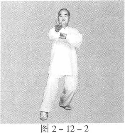 动作一:身体稍向右转沉,胸向南,眼看前方。左脚顺缠膝里 合,重心偏左腿;右脚顺缠外转,脚尖点地。左掌顺缠由左前上向 前上冽;右掌逆缠由右肋外向右胯外按。(图2-12-1)身体稍向左转沉,胸向南,眼看前方。左脚逆缠膝里扣,重心偏 左腿;右脚逆缠里转,脚尖点地。左掌逆缠由前上按至右肘弯上,掌 心向下;右掌顺缠由右胯外向胸前上探,掌心向上。(图2-12-2)动作二与一路第二势金刚捣碓动作六相同。(图1 -2-8)(图 1 -2-9)第十三势庇身锤与一路第十七势庇身锤相同。(图1 -17-1)至(图1 -17 -9)