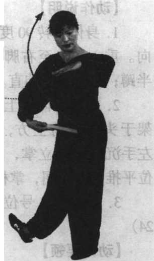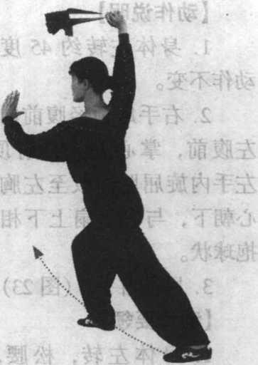 5 .左手推掌、右手扇上架,重心前移和身体右转应同时进 行。挺胸、立腰,略微向右拧腰。