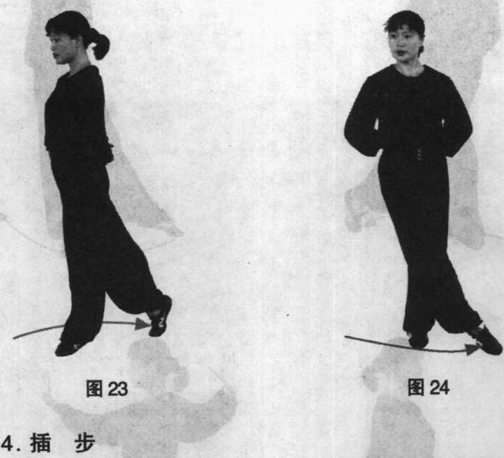 一腿支撑,另一腿经支撑腿前方向侧方横跨一步,前脚掌着 地。(图24)
