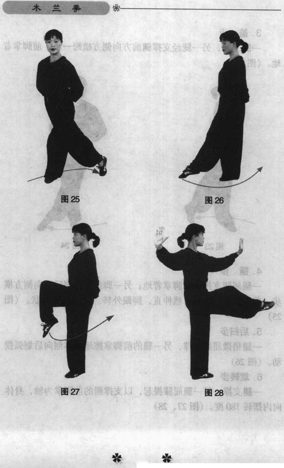一腿支撑,另一腿屈膝提起,以支撑腿的前脚掌为轴,身体 向内摆转180度。(图27、28)