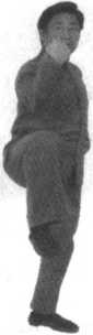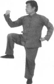 要点:身体略向右转再向左转,左掌变拳微逆缠,随即抬右腿,右拳内旋向上置于右前方。拳心朝里,左拳置于左肋前,拳