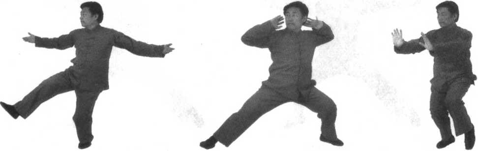 口令3(图7 -640.641) 右腿向右侧开步着地,同时两拳变掌向上至两耳旁。