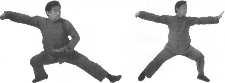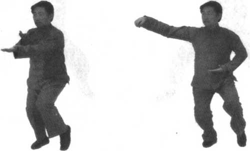 口令6(图7 -635) 重心迅速移至左腿,同时左手后收左肋旁,右拳向右前下方发出。