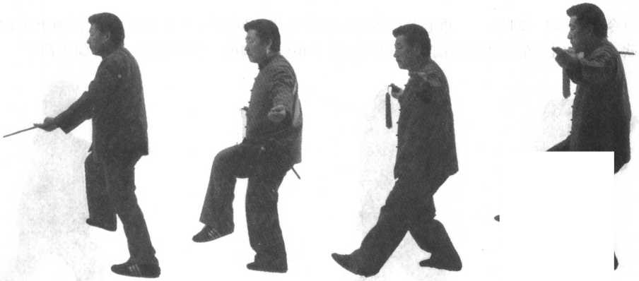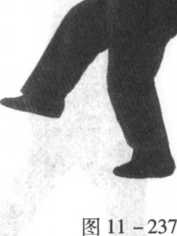 口令2(图11 -236、237) 左脚向前迈一步落地,随即重心移至左腿,右腿屈膝抬起,两臂