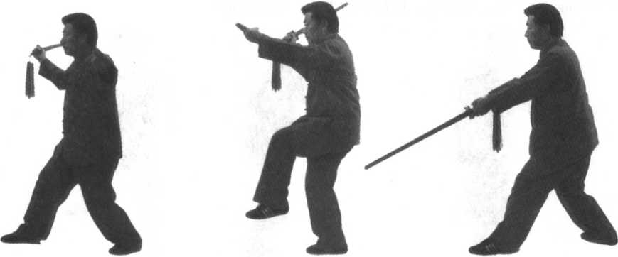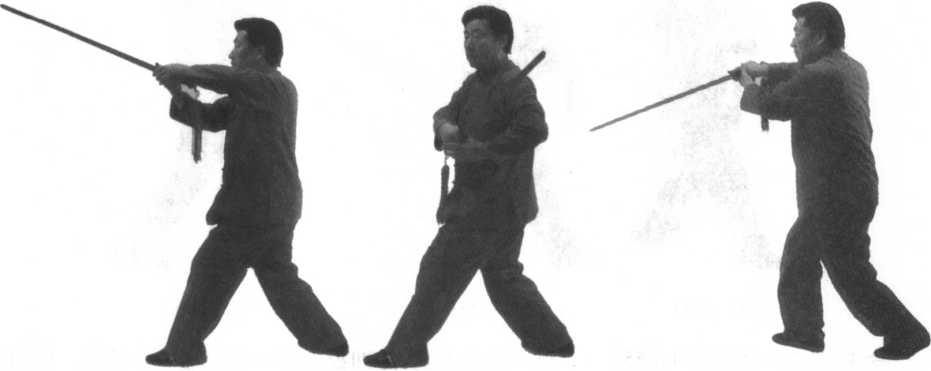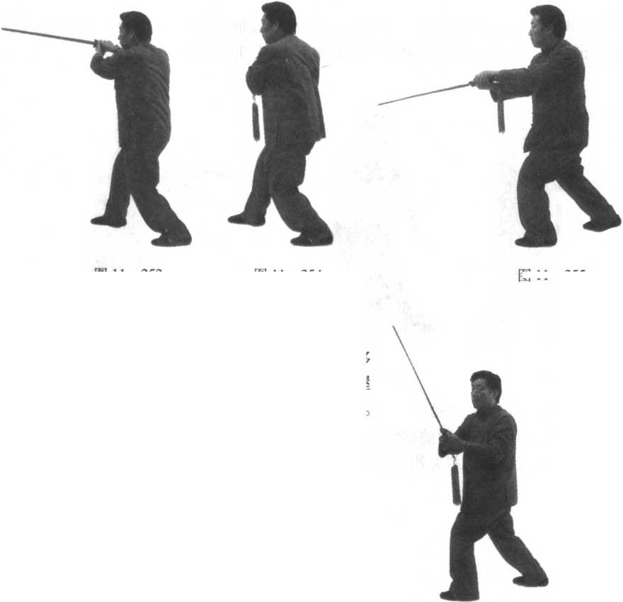 图 11 -253图 11 -253图 11 -254图 11 -254口令4(图11 -253.254.255) 重心移至左腿,随即提右脚向右后撤一步落地。同时两手握剑由胸经右上向后下再向前划弧撩剑至胸前,剑尖朝前下方。目视前方。(身朝正西)口令4(图11 -253.254.255) 重心移至左腿,随即提右脚向右后撤一步落地。同时两手握剑由胸经右上向后下再向前划弧撩剑至胸前,剑尖朝前下方。目视前方。(身朝正西)图 11 -256图 11 -256图 11 -255图 11 -255