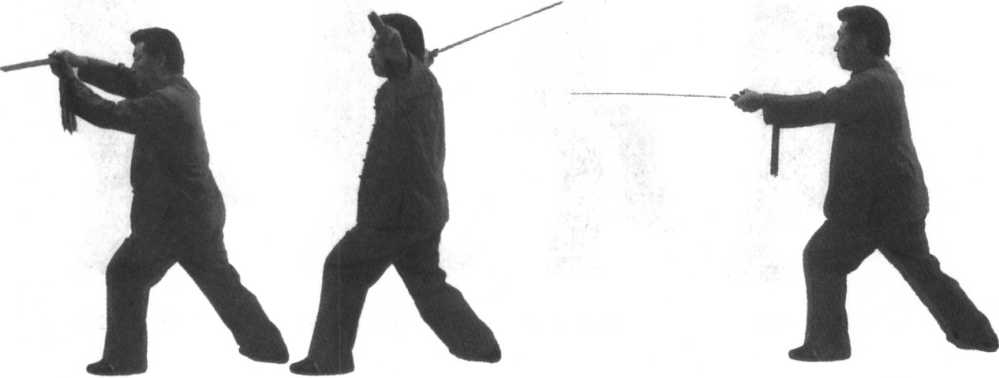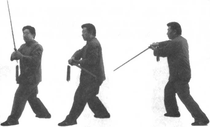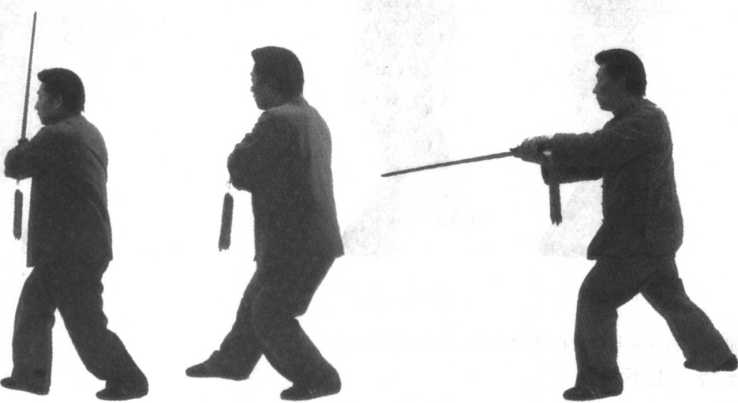 前相合握住剑柄,用腕力向前下方点刺。目视剑尖。(身朝正西)