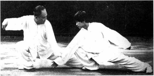 如对手用左手击来,我急 用左手将敌腕扼住,往左下 采,右腿与腰胯同时坐下,以 牵彼之力,而蓄我之气。